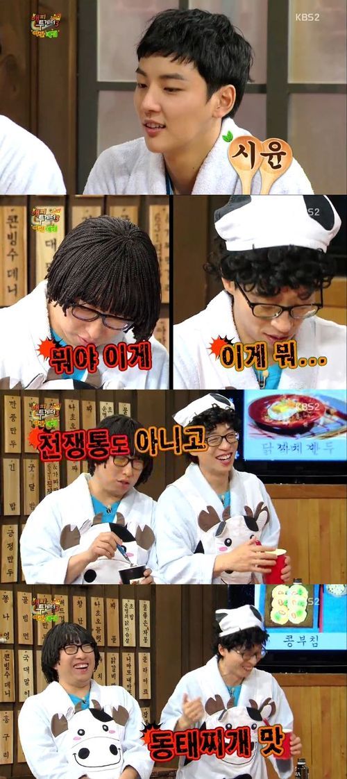 윤시윤은 5일 오후 방송된 KBS 2TV 예능프로그램 '해피투게더3'의 야간 매점 코너에서 컵라면 국물에 삼각김밥을 넣은 기괴한 요리를 선보였다.