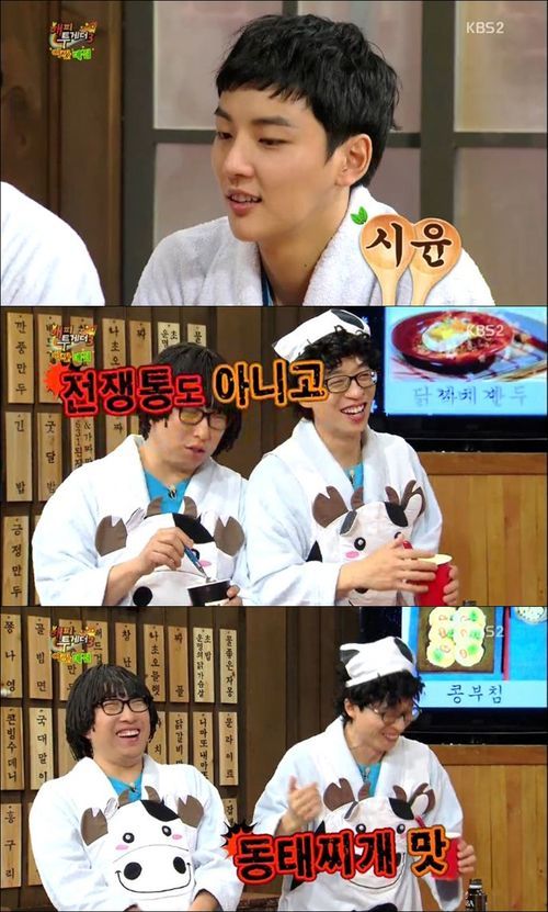 윤시윤은 5일 오후 방송된 KBS 2TV 예능프로그램 '해피투게더3'의 야간 매점 코너에서 짬뽕컵라면 국물에 김을 제외한 삼각김밥을 넣은 기괴한 요리를 선보였다.