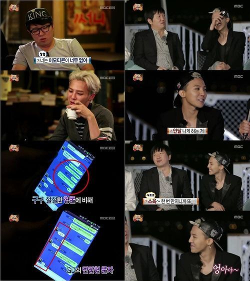 정형돈은 지드래곤에게 서운함을 드러내며 그와 주고받은 문자메시지를 공개했고, 이에 지드래곤은 “그런 것 어떻게 하는지 모른다”고 해명했다. 그럼에도 불구하고 정형돈은 “네가 나를 흔들어놓고. 좀 길게 해줬으면 좋겠어”라고 말해 웃음을 자아냈다.