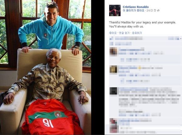 호날두는 6일(이하 한국시간) 자신의 SNS인 페이스북을 통해 과거 만델라와 찍은 사진을 공개하며 "당신이 이뤄낸 업적들에 감사하고 싶다"면서 "당신은 항상 우리와 함께 있을 것"이라고 말했다.