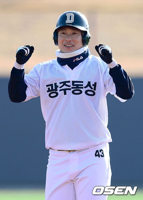6일 오후 포항구장에서 열린 '2013 야구대제전' 동성고와 덕수고의 경기, 동성고 이원석이 2타점 적시 2루타를 때린 뒤 더그아웃을 바라보며 기뻐하고 있다.