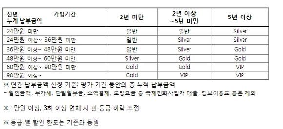 예를 들어, 매년 24만원을 지불하는 고객이 ‘실버’ 등급을 받으려면 기존 제도에서는 가입 후 5년이 지나거나 연간 납부 금액을 늘려야 했으나, 신규 제도에서는 가입 후 2년이 지나면 자동 승급된다.
