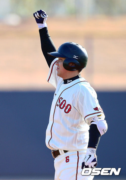 6일 오전 포항구장에서 열린 '2013 야구대제전' 동성고와 덕수고의 경기, 덕수고 김민성이 적시타를 때린 뒤 기뻐하고 있다.