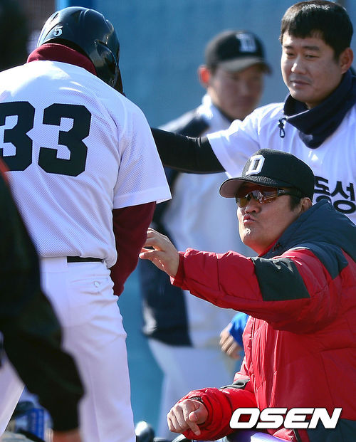 6일 오전 포항구장에서 열린 '2013 야구대제전' 동성고와 덕수고의 경기, 동성고 장채근이 최주환의 안타때 홈에서 아웃당한 문우람에게 이야기를 하고 있다.