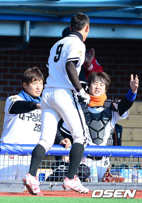 6일 오후 포항구장에서 열린 '2013 야구대제전' 군상상고와 상원고의 경기, 상원고 안지만과 백정현이 득점을 올리고 더그아웃으로 들어오는 후배와 하아피이브를 하고 있다.