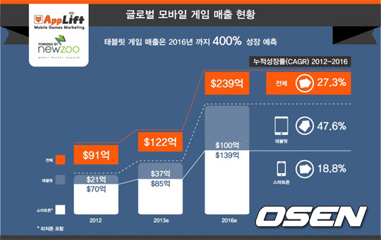 글로벌 모바일 게임 시장은 2016 년까지 연간 27.3 % 성장하여 239 억달러에 도달할 것으로 예상됐다. 모바일 게임의 유료 결제 유저와 평균 결제 금액의 증가로 힘입어 성장할 것으로 예측된 가운데 태블릿 게임 시장은 2016 년까지 400 % 성장하여 100 억 달러에 도달 할 것으로 전망됐다.