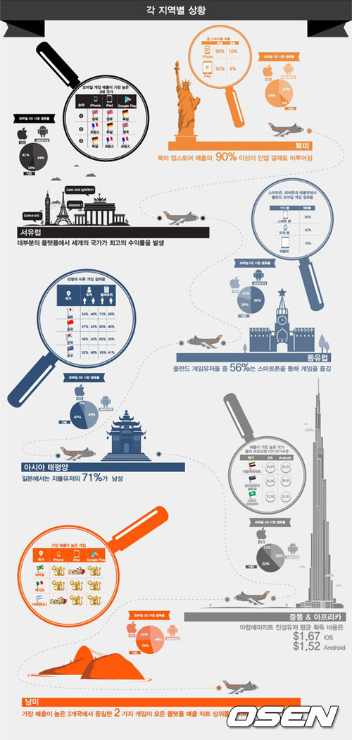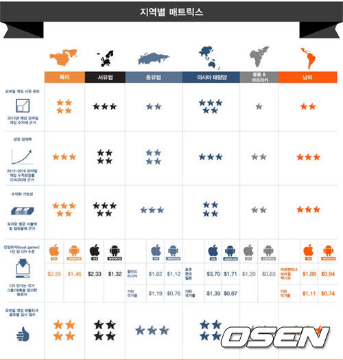 유저당 평균 지출비용은 서유럽 이 4.4 달러 를 기록 하여 가장 높은 지역이며 북미는 3.87 달러으로 세계적으로 가장 많은 유료 결제 유저를 보유한(45%) 것으로 파악됐다. 남미의 모바일 게임 진성 유저 취득 비용은 iOS, 안드로이드에서 각각 1.11달러와 0.74달러. 일본, 한국과 호주를 포함한 아시아 태평양 지역은 iOS 3.70달러, 안드로이드는 1.71달러로 나타나 종합적으로 서유럽, 북미 및 아시아 태평양 지역은 모바일 게임 퍼블리셔에게 가장 매력적인 시장 인것으로 분석됐다.