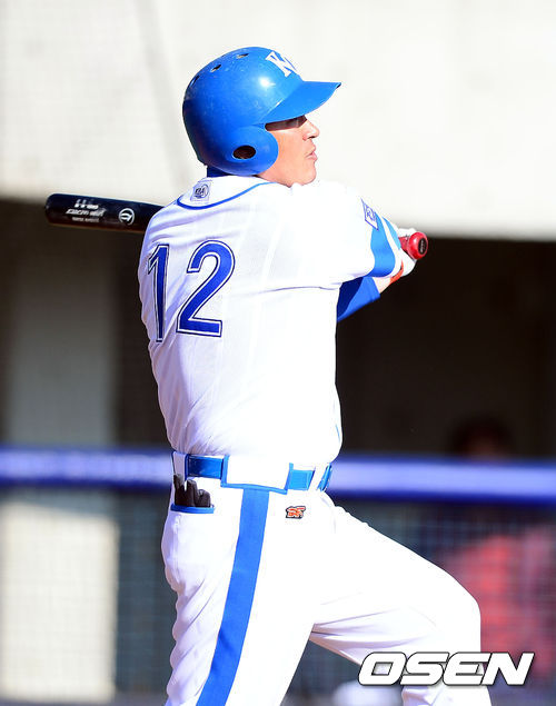 6일 오후 포항구장에서 열린 '2013 야구대제전' 군상상고와 상원고의 경기, 군산상고 신경현이 1타점 희생플라이를 때리고 있다.
