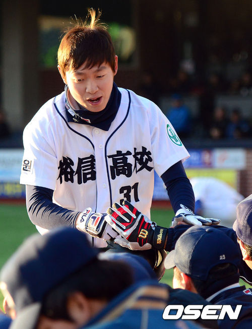 6일 오후 포항구장에서 열린 '2013 야구대제전' 충암고와 유신고의 경기, 유신고 정수빈이 득점을 올린 뒤 동료들과 기뻐하고 있다.