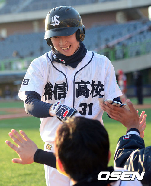 6일 오후 포항구장에서 열린 '2013 야구대제전' 충암고와 유신고의 경기, 유신고 정수빈이 득점을 올린 뒤 동료들과 기뻐하고 있다.