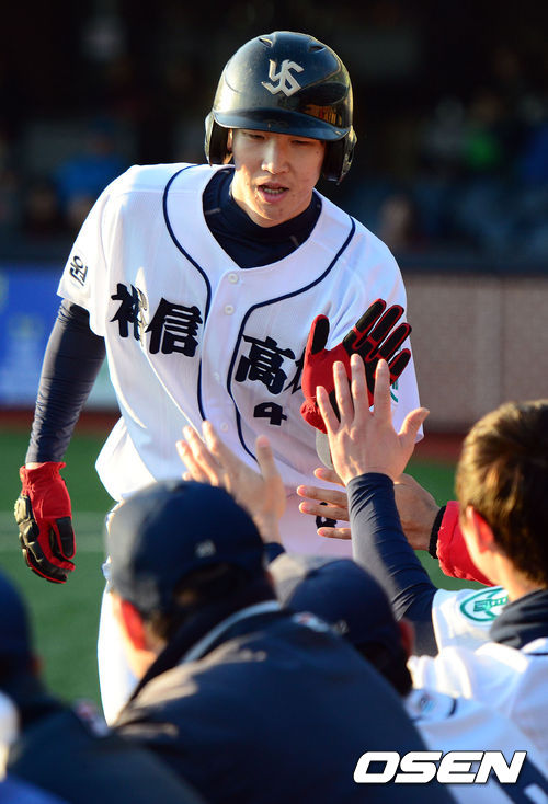 6일 오후 포항구장에서 열린 '2013 야구대제전' 충암고와 유신고의 경기, 유신고 최항이 득점을 올린 뒤 동료들과 기뻐하고 있다.