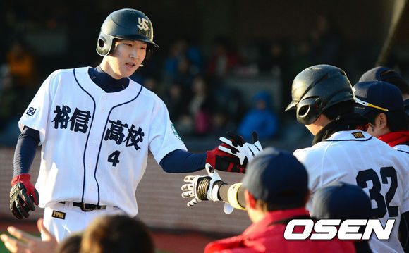 6일 오후 포항구장에서 열린 '2013 야구대제전' 충암고와 유신고의 경기, 유신고 최항이 득점을 올린 뒤 동료들과 기뻐하고 있다.