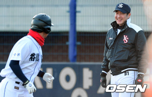6일 오후 포항구장에서 열린 '2013 야구대제전' 충암고와 유신고의 경기, 유신고 1루 코치 유한준이 희생플라이로 물러난 최정과 이야기를 나누고 있다.
