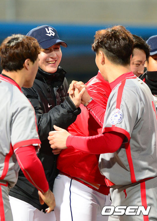 6일 오후 포항구장에서 열린 '2013 야구대제전' 충암고와 유신고의 경기에서 승리를 거둔 유신고 유한준이 충암고 장성호와 이야기를 나누고 있다.