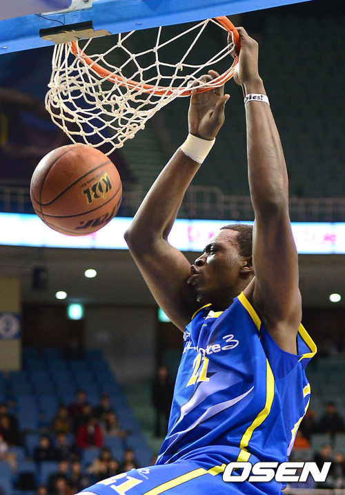 1쿼터 삼성 더니건이 투핸드덩크슛을 성공시키고 있다.