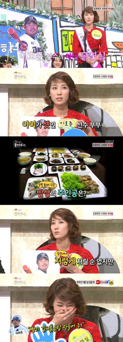 6일 오후 방송된 KBS2 '가족의 품격-풀하우스'에는 홍성흔(두산 베어스)의 아내 김정임, 이호준(NC 다이노스)의 아내 홍연실, 박병호(넥센 히어로즈)의 아내 이지윤, 최형우(삼성 라이온즈)의 아내 박향미가 출연해 내조 비법과 부부간의 에피소드를 털어놓는 모습이 전파를 탔다.