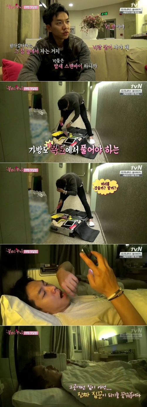 '꽃보다 누나' 가이드 겸 짐꾼 이승기가 김희애, 이미연을 배려해 같은방에서 자는 걸 포기하고 VJ가 사용하는 장비방에서 잠을 자기로 결심했다.