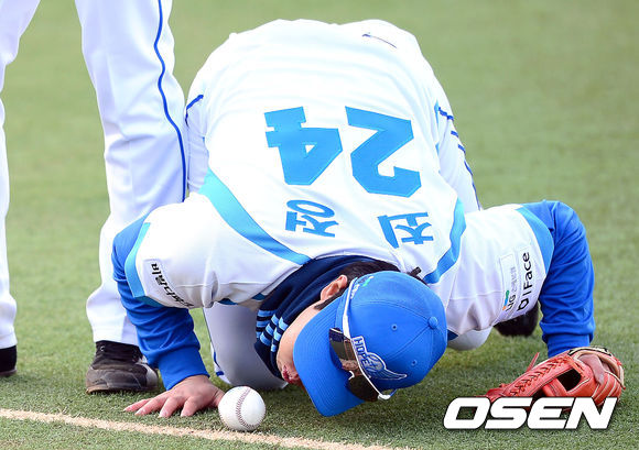 1회초 2사 양신팀 3루수 최정이 종범신 정준하의 타구를 파울라인으로 넘기려고 입김을 불고 있다.