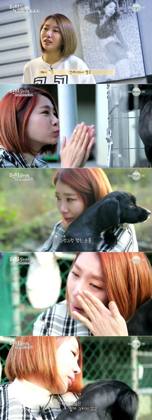 걸그룹 브라운아이드걸스 멤버 제아가 유기견 입양센터를 통해 반달이와 첫 만남을 갖고 눈물을 글썽였다.