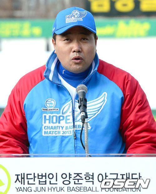 경기에 앞서 양준혁이 인사말을 하고 있다.