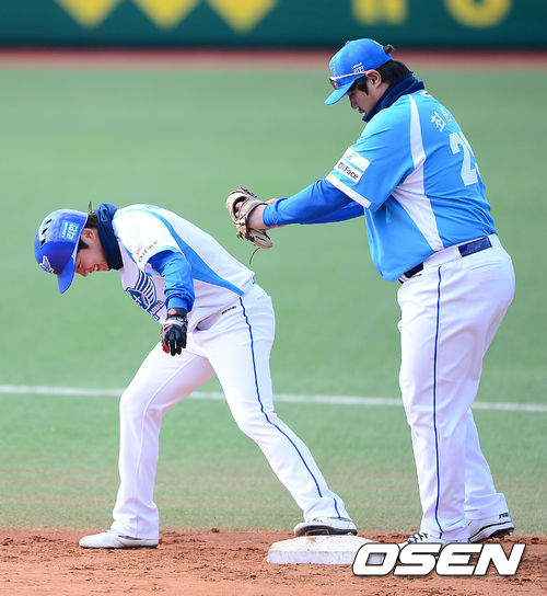 종범신 최준석이 안타를 때린 뒤 2루까지 진루한 정수빈을 몸으로 밀어내고 있다.