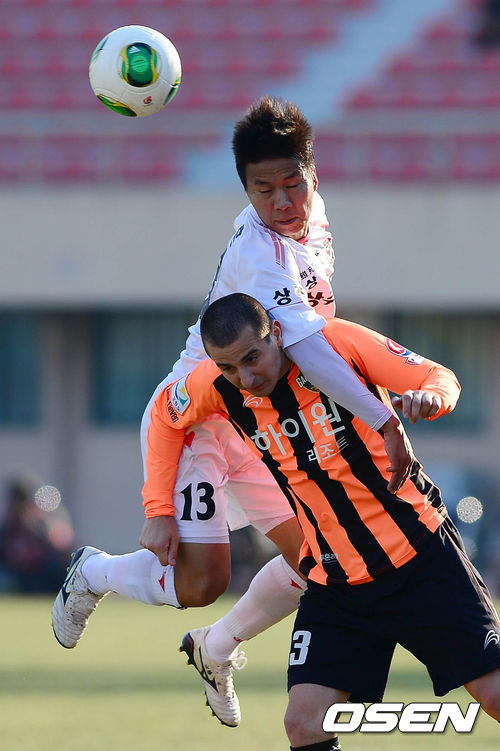 7일 오후 강릉시 강릉종합운동장에서 열린 2013 현대오일뱅크 K리그 승강 플레이오프 2차전 강원 FC와 상주 상무의 경기 전반 정훈과 지쿠가 볼다툼을 벌이고 있다.