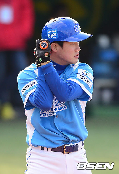 종범신팀 이여상이 마해영의 타격자세를 흉내내고 있다.