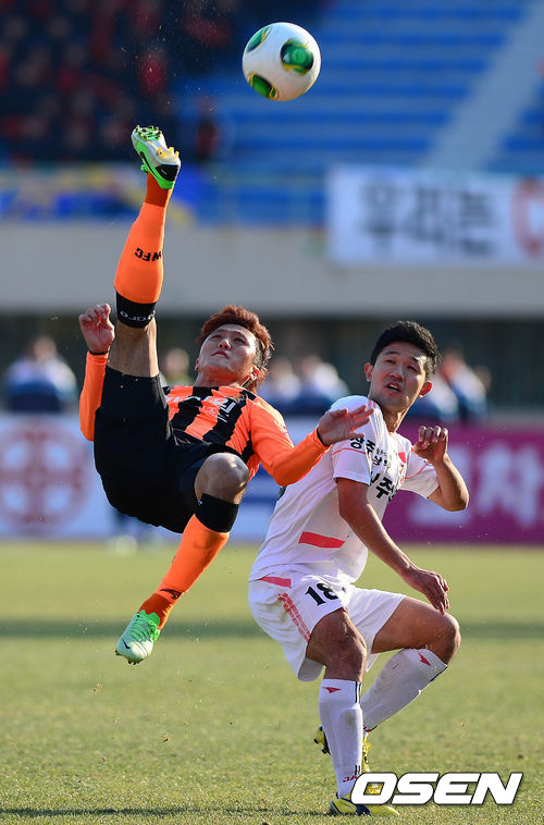 7일 오후 강릉시 강릉종합운동장에서 열린 2013 현대오일뱅크 K리그 승강 플레이오프 2차전 강원 FC와 상주 상무의 경기 전반 강원 김오규가 볼을 걷어내고 있다.