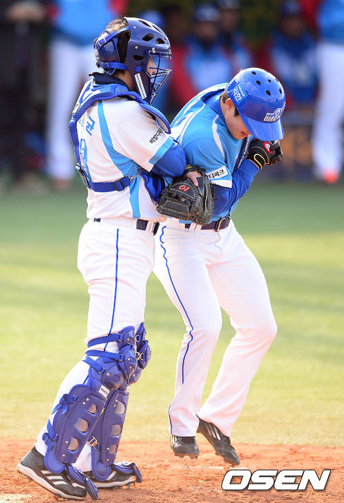 종범신팀 이여상이 포수 황재균과 장난을 치고 있다.