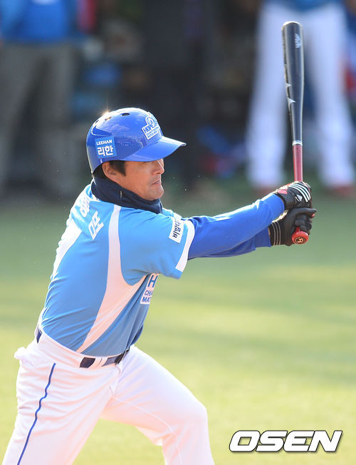종범신팀 이종범이 양신팀 양준혁을 상대로 안타를 때리고 있다.