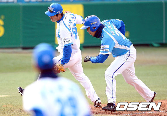 5회초 2사 종범신팀 배영수가 런다운에 걸려 아웃당하고 있다.