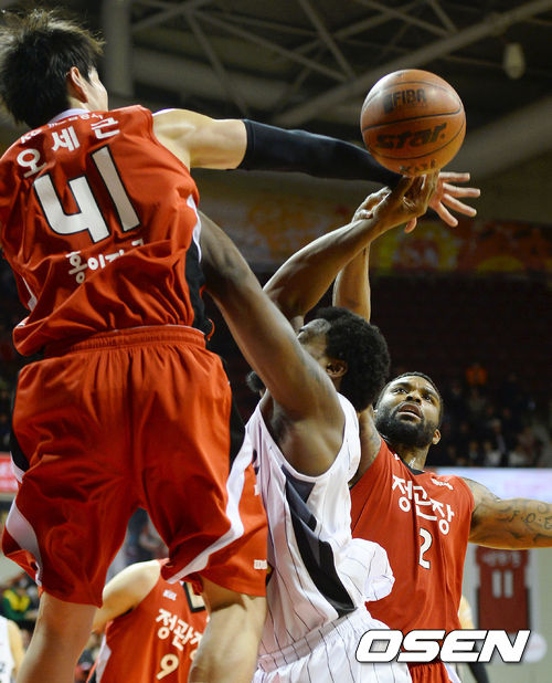 3쿼터, KGC 오세근이 LG메시를 수비하고 있다.