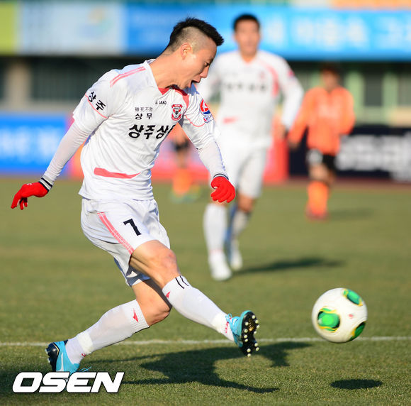 7일 오후 강릉시 강릉종합운동장에서 열린 2013 현대오일뱅크 K리그 승강 플레이오프 2차전 강원 FC와 상주 상무의 경기 후반 이승현이 슈팅을 시도하고 있다.