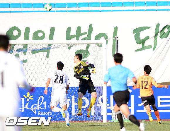 7일 오후 강릉시 강릉종합운동장에서 열린 2013 현대오일뱅크 K리그 승강 플레이오프 2차전 강원 FC와 상주 상무의 경기 후반 최승인이 골을 넣고 있다.