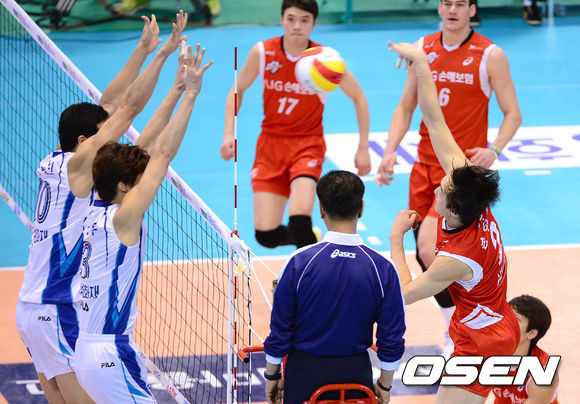2세트 LIG손해보험 손현종이 삼성화재의 블로킹 벽을 피해 공격을 시도하고 있다./sunday@osen.co.kr