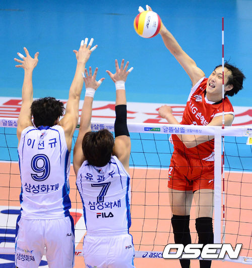 2세트 LIG손해보험 손현종이 삼성화재의 블로킹 벽을 피해 공격을 시도하고 있다./sunday@osen.co.kr