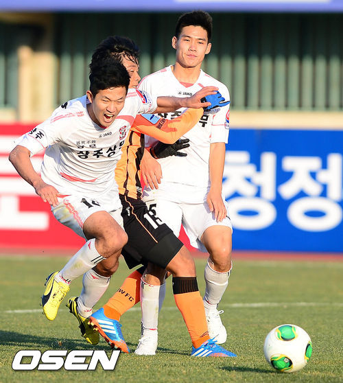7일 오후 강릉시 강릉종합운동장에서 열린 2013 현대오일뱅크 K리그 승강 플레이오프 2차전 강원 FC와 상주 상무의 경기 후반 이상호가 볼을 문전에서 쫓아가고 있다.