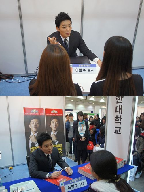 이범수는 지난 6일 KBS 2TV 새 월화드라마 ‘총리와 나’ 밤샘촬영 중에도 시간을 내 서울 삼성동 코엑스에서 열린 2014학년도 정시 대학입시박람회에 참석했다. 이범수는 배우가 아닌 신한대학교 공연예술학과의 학과장으로 대입을 앞둔 학생들을 만나 직접 입학상담을 진행했다.