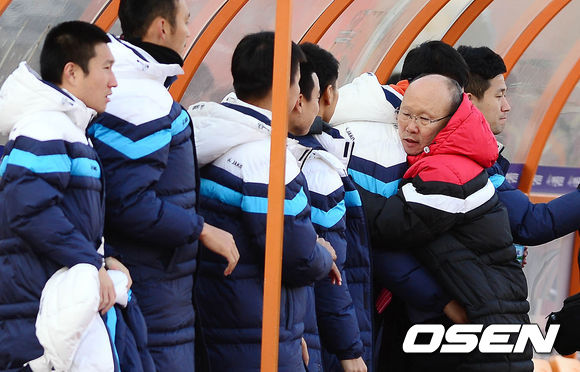 7일 오후 강릉시 강릉종합운동장에서 열린 2013 현대오일뱅크 K리그 승강 플레이오프 2차전 강원 FC와 상주 상무의 경기 종료 후 박항서 감독이 벤치에 앉아있는 선수들과 포옹을 하고 있다.