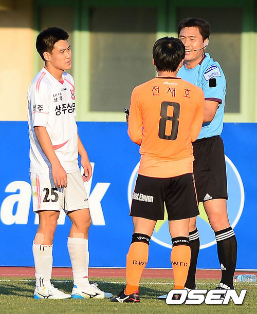 7일 오후 강릉시 강릉종합운동장에서 열린 2013 현대오일뱅크 K리그 승강 플레이오프 2차전 강원 FC와 상주 상무의 경기 후반 최철순과 전재호 사이에서 말다툼 시비가 붙자 심판이 주의를 주고 있다.