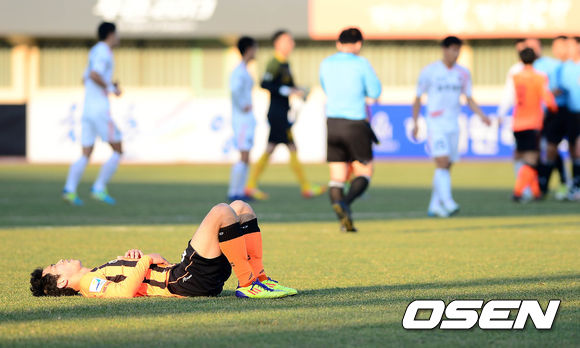 7일 오후 강릉시 강릉종합운동장에서 열린 2013 현대오일뱅크 K리그 승강 플레이오프 2차전 강원 FC와 상주 상무의 경기 종료 후 강원 최우재가 그라운드에 아쉬운 표정으로 누워있다.