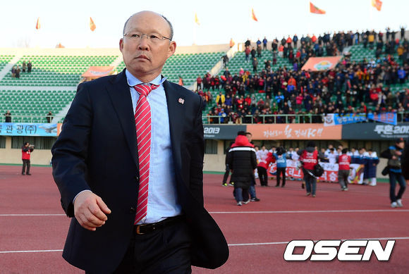 7일 오후 강릉시 강릉종합운동장에서 열린 2013 현대오일뱅크 K리그 승강 플레이오프 2차전 강원 FC와 상주 상무의 경기 종료 후 박항서 감독이 인터뷰를 위해 자리를 떠나고 있다.