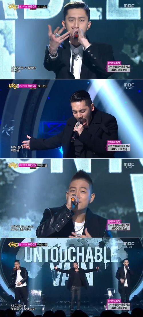 언터쳐블은 7일 오후 방송된 MBC '쇼!음악중심'에서 네 번째 미니앨범 '트립(TRIP)'의 타이틀곡 '배인(VAIN)'을 열창했다.