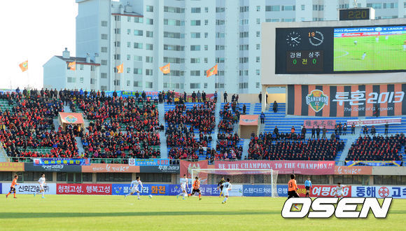 이날 경기장에는 3062명의 관중이 운집했다. 그 중 1/3 가량이 상주응원단이었다. 드문드문 앉은 강원 팬들과 달리 골대 뒤편에 위치한 상주응원단은 조직적인 응원을 펼쳐 홈팀 강원의 기를 눌렀다. 특히 상주의 공격이 거셀 때마다 터져 나온 꽹과리 응원은 상주 선수들의 흥을 돋우기에 충분했다.