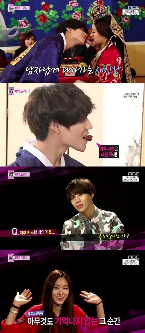 MBC 예능 프로그램 '우리 결혼했어요4'에서 태민과 나은이 고난도 스킨십인 대추키스에 도전하며 매우 긴장한 모습을 보였다.