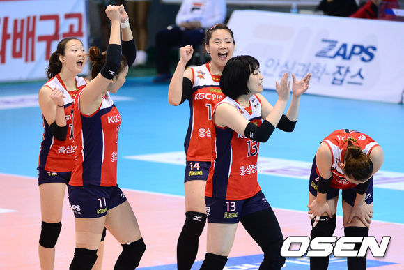 4세트 KGC인삼공사 선수들이 비디오판독 끝에 득점으로 인정되자 환호하고 있다.