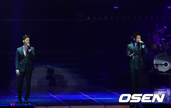 7일 오후 서울 올림픽공원 내 SK올림픽핸드볼경기장에서 열린 2AM 콘서트 '녹턴: 야상곡'에서 2AM의 조권과 이창민이 열창을 하고 있다.