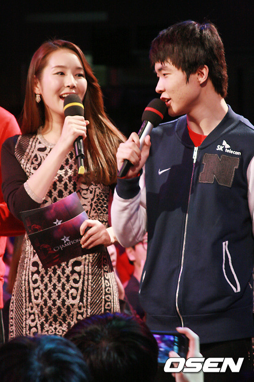 SK텔레콤 K가 7일 서울 용산 온게임넷 e스포츠 상설경기장에서 열린 '판도라TV LOL 챔피언스(이하 롤챔스)' 윈터 2013-2014 A조 CJ 블레이즈와 경기서 2-0 완승을 거뒀다. 이날 승리로 SK텔레콤 K는 A조서 3전 전승을 기록하면서 8강에 안착했다. 경기 후 리포터 조은나래가 승리의 주역인 MVP 이상혁, 이정현과 인터뷰를 진행하고 있다.