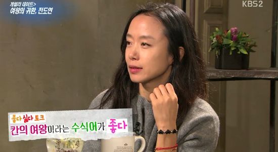 전도연은 7일 오후 방송된 KBS 2TV '연예가중계'에서 "칸의 여왕이라는 수식어가 좋냐"는 리포터의 질문에 "좋다"고 답했다.