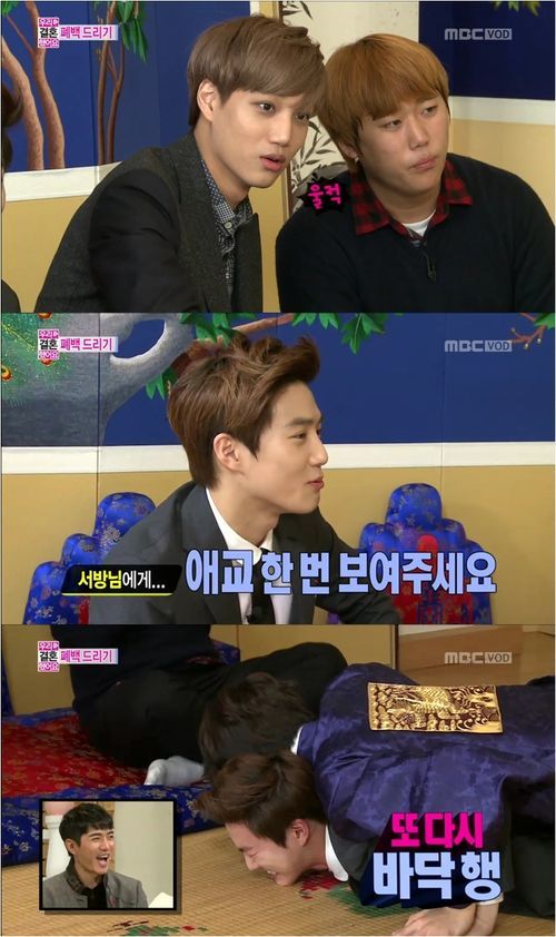 물론 수호는 연신 장난을 걸다가 태민에게 말려들며 신랑보다 더 많은 진땀을 뺐다. 바로 태민을 등에 업고 팔굽혀펴기를 시도했다가 두 번이나 실패하는 굴욕을 당한 것. 수호는 “바닥이 미끄러운 것 같다”고 능청스럽게 해명했지만, 이미 당황한 표정은 시청자들에게 귀여운 매력을 한번 더 뽐내는 계기가 됐다.